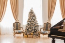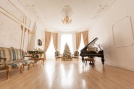 Пространство — 50 кв. метров Три больших окна, 2 из них с выходом на балкон. Потолок — лепнина, люстра. Стены — лепной декор, бра. Мебель - французский ретрогарнитур: диван с двумя креслами, журнальный столик с мраморной столешницей. Зона с декоративным камином и дымоходом. Чёрный рояль. Источники Hensel Expert Pro 500 (3 шт)