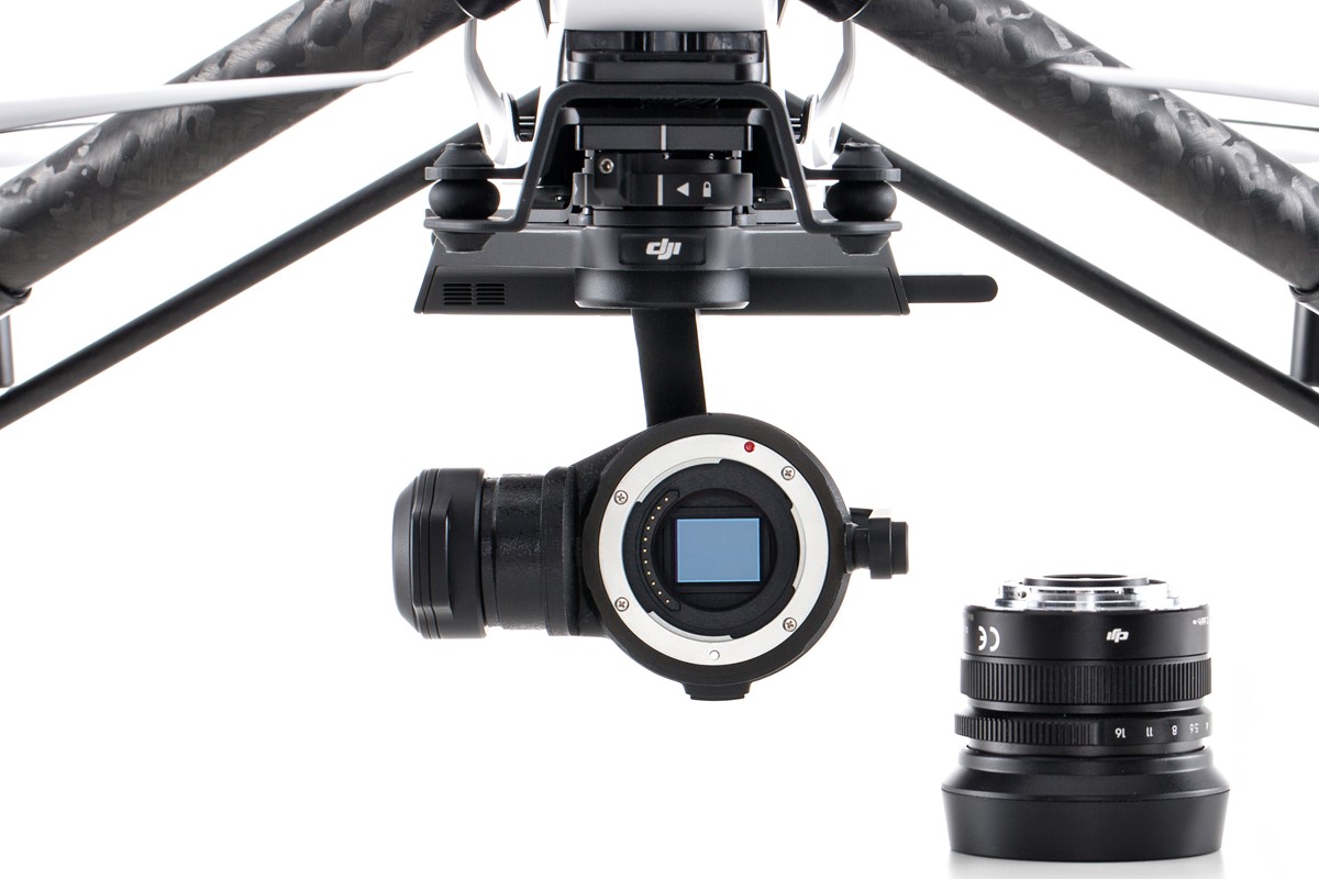 Камера Zenmuse X5R имеет байонет для установки сменных объективов, обеспечивает дистанционное управление диафрагмой и фокусировкой, способна записывать видео в формате 4К.